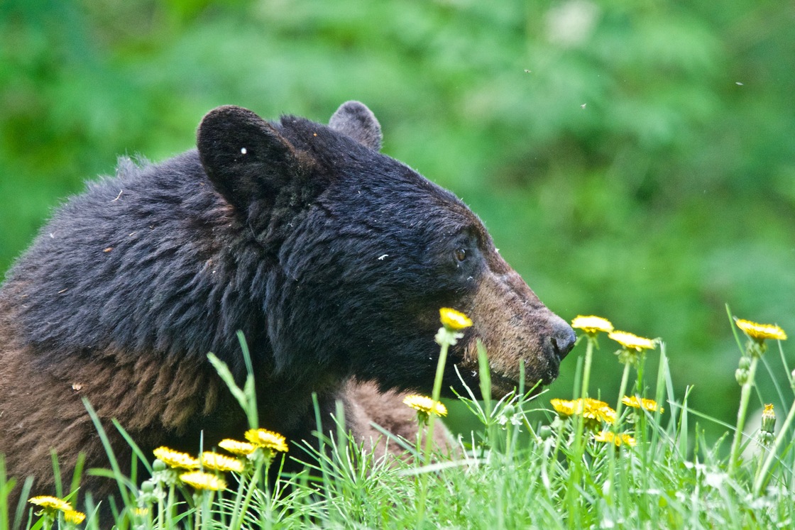 A two toned black bear braves some roadside spring dandelions near Terrace, BC.