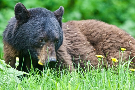 A two toned black bear braves some roadside spring dandelions near Terrace, BC.