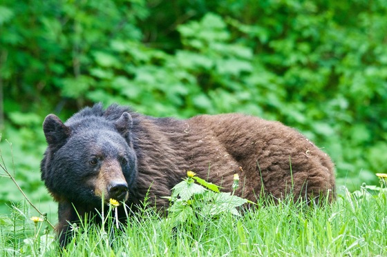 A two toned black bear braves some roadside spring dandelions near Terrace, BC.