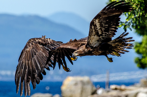 Two of the Juvenile Bald Eagles who flew right over my head and in front of me during a fierce chase. The next day I was gifted with one of their tail feathers which lay in front of me on the beach.