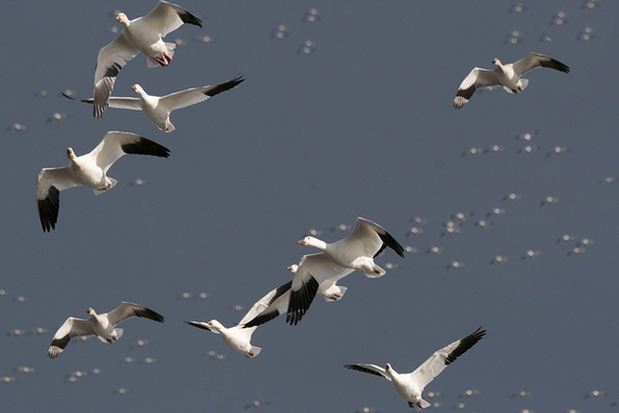 Envolée d'oies blanches au réservoir Beaudet à Victoriaville (Québec).