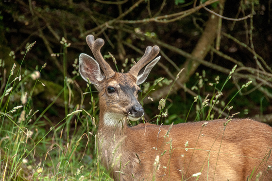 I was surprised to find this young White-tailed deer nibbling on grass when I emerged from Ruckle Park one morning. I love the coy look he gave me!