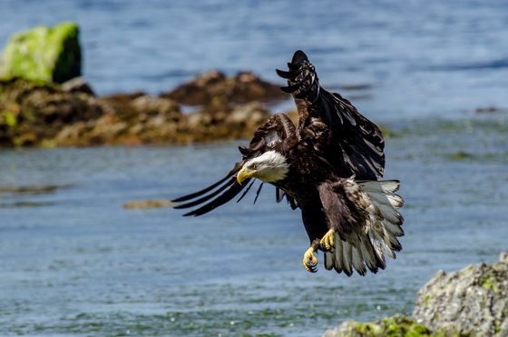 This past May we had over 30 visitor Bald Eagles down at the Bay near my home. And, for some reason, they let me get quite close on occasion so I was able to capture this handsome eagle in mid-flight as he took off from his rocky perch near the shore.