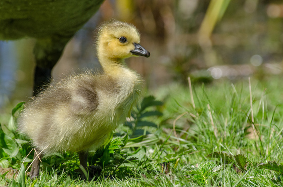 When I was in Vancouver for a week this past May, I really loved visiting the pond at Jericho Beach Park where I discovered two families of Canada Geese, one of which had nine goslings and one of which had only one, who was the smallest of all, but certainly not the most timid. One morning while I sat on the grass I watched in amazement as this fuzzy gosling helped his parents chase away a feisty group of hungry crows. In my photo, you can see how proud this little one is, standing beneath his Mom.