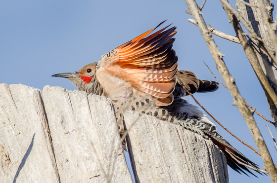 There are pairs of Northern Flickers, who I've tracked during the Spring in Jericho Beach Park, but it wasn't until this past November that I got a rather unusual — for me — shot of one of the males preening. He looks so sweet plopped atop one of his favourite snags, making sure his plumage stays in the best condition.