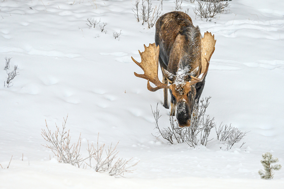 Majestic moose bull (Alces alces) standing in snow in a winter forest in Jasper National Park, Alberta, Canada