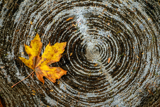 Natural background of a colorful autumn leaf on a tree trunk that shows its growth ring