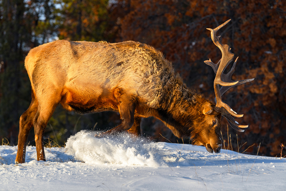 Wild Elk or also known as Wapiti (Cervus canadensis) in the winter snowfall in Jasper National Park, Alberta, Canada