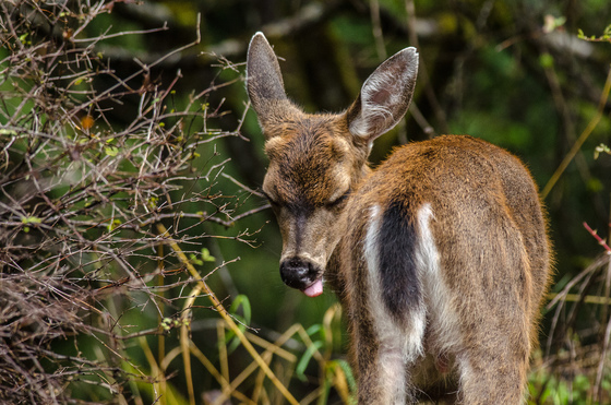 The Common Land around my home is like a Nature Reserve where we can see all kinds of creatures, like this White-tailed Fawn with his little, "antler-bumps" intent on grooming himself while his Mom forages.