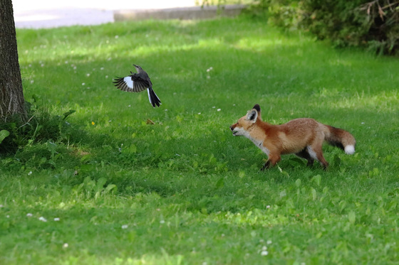 Apparently the fox kit did not learn his lesson. I came back a week later and he was getting attacked again by the mocking birds, I’m beginning to wonder if this is a daily occurrence for him. This time he got a little closer when the bird came lower to the ground. I guess practise makes perfect.