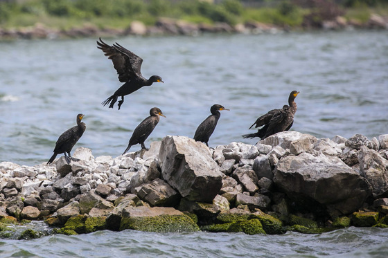 Looks like the Cormorants were having a family reunion at the beach front. It was so crazy windy at the point that I had to lean against a post to keep myself steady as I took this photo. I had set up the tripod but the wind knocked it over. Even the cormorants had difficulty flying, this one tried several times to get from one end to the other but kept getting blown back. At this point he was actually hovering, not going anywhere, finally he made it. Love how the one in the back is watching him fly to see if it’s worth the effort.