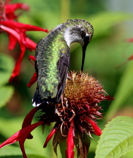 A Ruby-throated Hummingbird sitting on top of cornflower feeding on nectar.