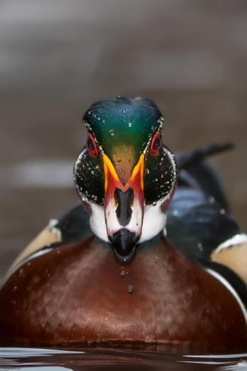 Wood Duck drake in Halifax, NS with parted feathers just after surfacing.