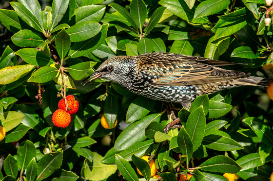 Last mid-November we enjoyed some glorious, sunny days and it was on one of those mornings that I spotted a small flock of European Starlings gobbling the bright berries of an Arbutus tree in our village, Ganges. It was so much fun photographing these feisty birds while my family went grocery shopping.