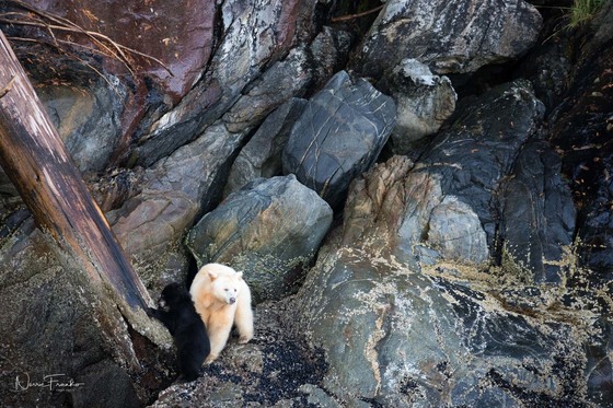 What an absolute treat to watch this pair. Strawberry a Kermode ( Spirit) Bear and her cub Hope as they foraged along the coast line.