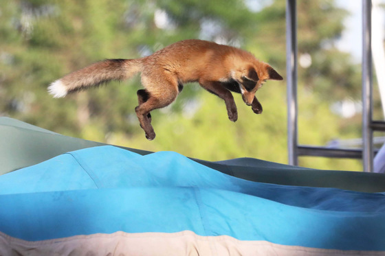 This is one of my favourite leaps! One of the fox kits was in the bottom of the boat, this one came walking along and saw him and took a flying leap into the air to pounce on him. Hilarious!