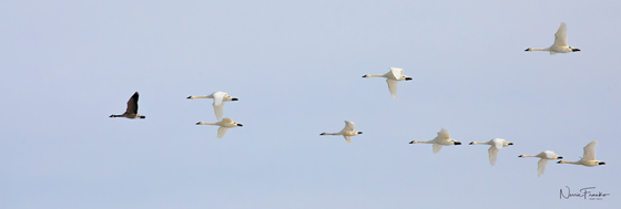 I arrived at Rock Point Provincial Park hoping to encounter tundra swans. I set myself up on a point and waited. There were many people out walking dogs so any birds approaching my position veered off before coming close. Finally I heard the tell tale musical sound of the tundras approaching a finally quiet beach. To my surprise and delight I realize a Canada Goose was leading the way. Canadian hospitality at its finest.