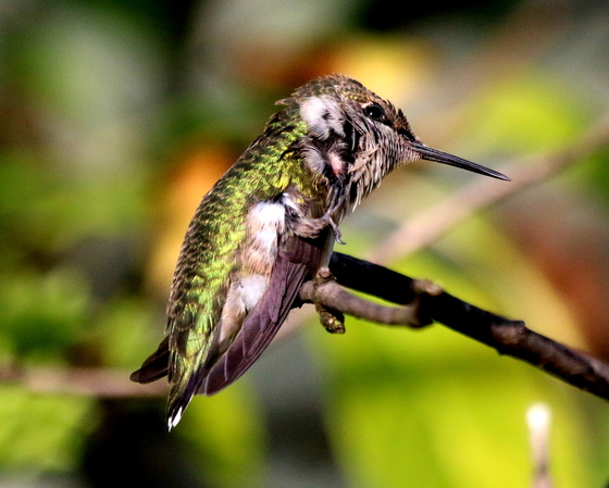 A Ruby-throated Hummingbird scratches an itch on his neck.