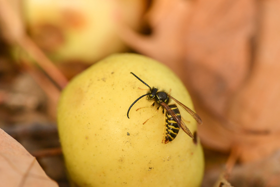 In the fall when the unpicked apples have dropped to the ground, many insects will feed upon the rotting fruit. This Vespid wasp was photographed while it was feeding on one such apple.