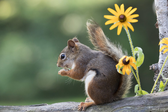 Little Red was my backyard entertainment most days. This year the little imp decided he would sample my limited flower selection. It took me a while to catch him in the act.