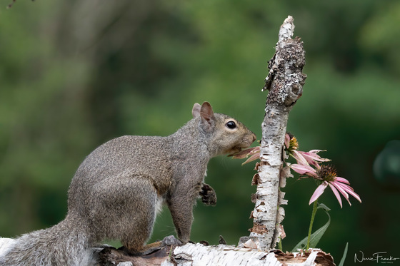 Little Mama is a grey squirrel that comes to visit from time to time. She watched a little red squirrel get my attention by destroying my flowers and thought she would try too. It worked, she left the flowers alone but got some bird seed thrown on the ground away from the flowers. It became a game for us. She had her own little snack time routine.