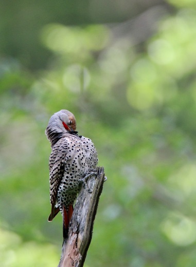 I had been sitting near a pond trying to capture some duck photos when this Northern Flicker landed on this stump and decided it was going to have a nap.