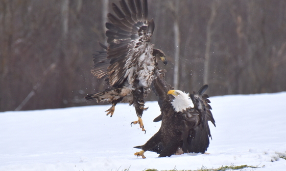 A mature eagle defends his meal against a juvenile in Sheffield Mills, N.S.