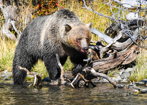 Male Grizzly with a bloody face after eating a Sockeye Salmon, already looking for another.