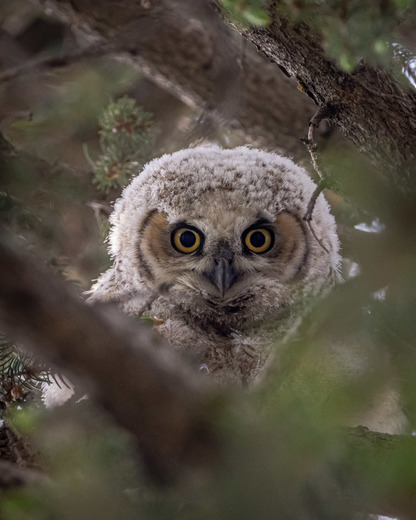 I found a horned owl nest inside of Calgary city limits. I spent quite a few weeks returning to the nest waiting fore them to hatch, then for the right lighting and angle and was finally rewarded as I stood at the base of the tree looking straight up and this little guy was peering straight down at me!