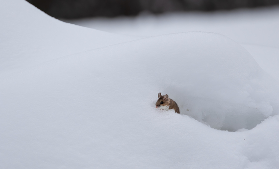 I was waiting patiently to see if I could photograph a Pine Marten, when I saw some movement in the snow. This little Deer Mouse was making its way to a recycling bin in Algonquin Provincial Park. It would duck under the snow and then pop up! It made a really quick dash and got there safe and sound. It was so cool to see this little one!