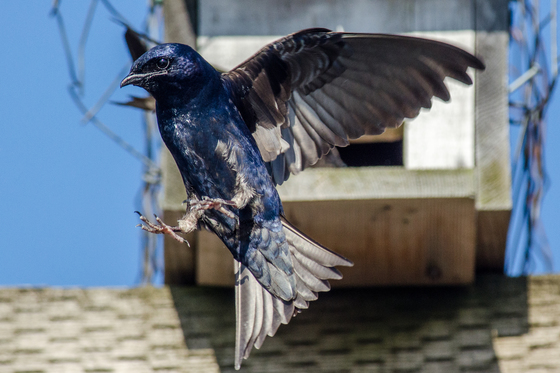 On Salt Spring, dedicated volunteers have built nest boxes for the Purple Martins who come to visit us each Spring. These swallows are a delight to photograph and to watch. I caught this male at Fernwood Dock last May.