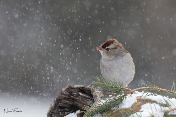 A White Crown Sparrow visiting the yard on a lovely snowy day.