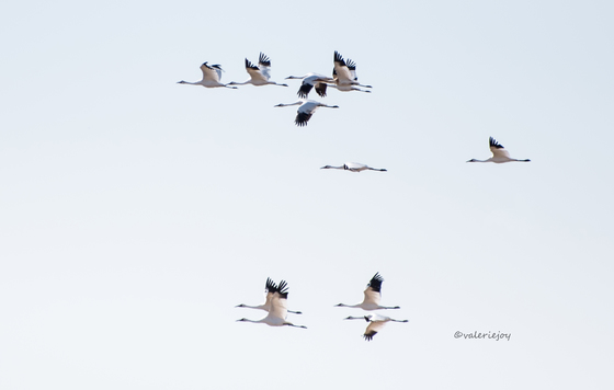 Whooping cranes in the wild create poetry over a prairie field.