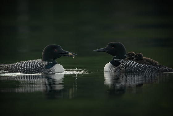 These two loon chicks were in their first week and taking full advantage of the free ride. Riding on the adults keeps them safer when they are small from predators lurking below.