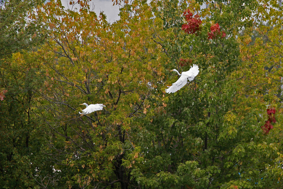 great egrets put on an aerial ballet with fall colors as a backdrop