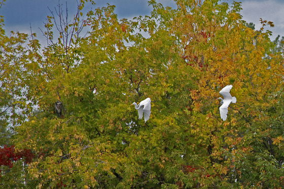 great egrets put on an aerial ballet with fall colors as a backdrop