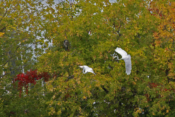 great egrets put on an aerial ballet with fall colours as a backdrop