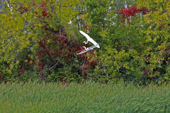 great egrets put on an aerial ballet with fall colours as the backdrop