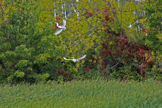 great egrets put on an aerial ballet with fall colours as the backdrop