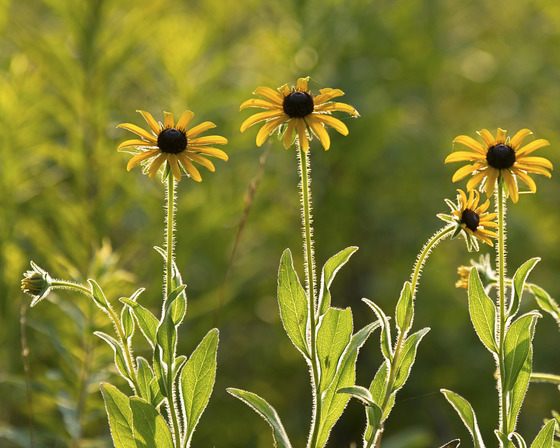 Late afternoon sun blacklighting the brown eyed susans