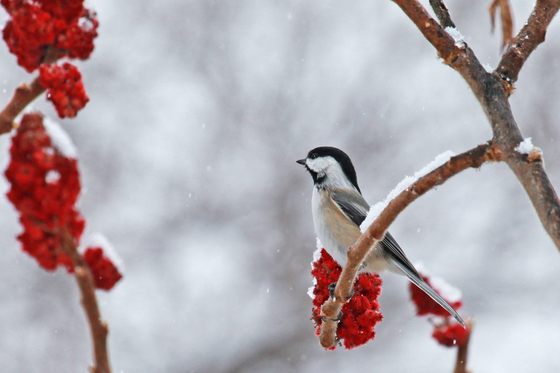 sumac makes a vibrant splash of color and attracts a chickadee on a snowy winter day