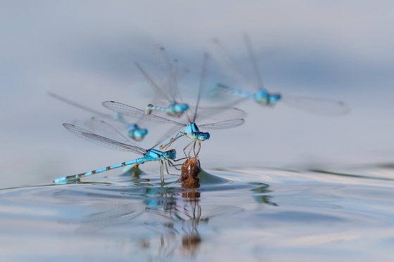 There were many dozens, if not more than a hundered, of the common Bluets Damselflies all jockeying for this single perch sticking out of the water. Every once in a while a wave would wash over it, with the race for the perch starting anew. This went on for well over an hour, and still going on strong when I left.