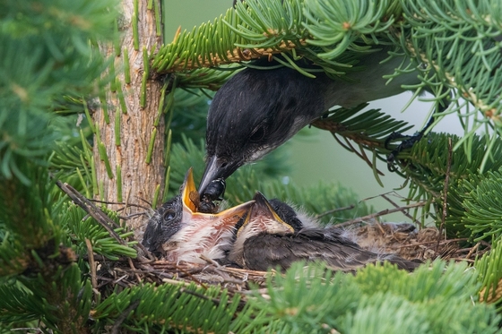 A parent Eastern Kingbird offers a juicy insect to one of the brood. The triplets would fledge a couple of days later.