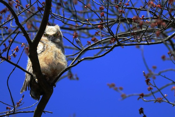 This adorable Great Horned Owl chick is probably the cutest baby animal I’ve seen. He’s just a ball of fluff with huge eyes, I’m amazed he could fly from the nest to this branch with those tiny fluffy wings. I wanted to stay and watch him all day long. I spent an hour just watching him and his sibling, who was sitting in a different tree. I hoped momma would come check on her chicks, but she must have been out hunting or watching me watching them from afar.
