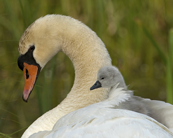 This little mute swan cygnet was happy to catch a ride on its mother's back.