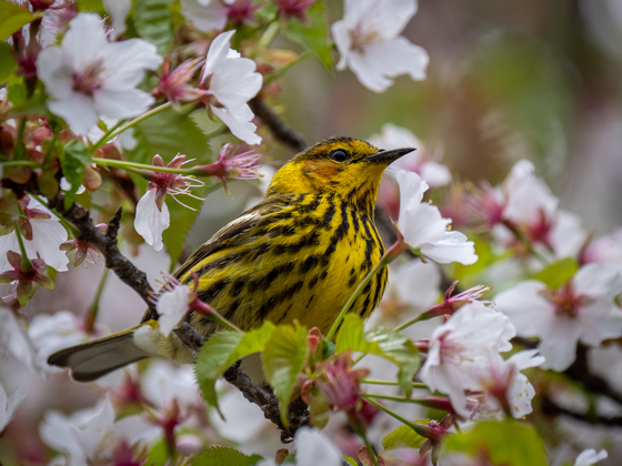 Cape May Warbler searching for a meal among the spring blooms