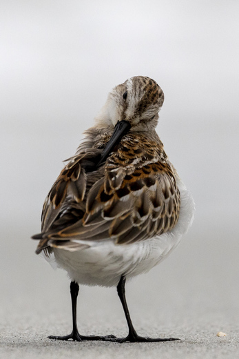 As the surf pounded onto this remote beach, shorebirds ran across the sand in groups of mixed species. From a distance, I laid down in the sand on my stomach, and waited for their flurry of activity to bring them close to me. The shorebirds darted in and out of the frothy water, probing the sand with their bills for unlucky amphipods, when this Western Sandpiper stopped and began grooming itself. Ruffling through its feathers, it only paused for a minute, before it continued running across the sand with its flock.