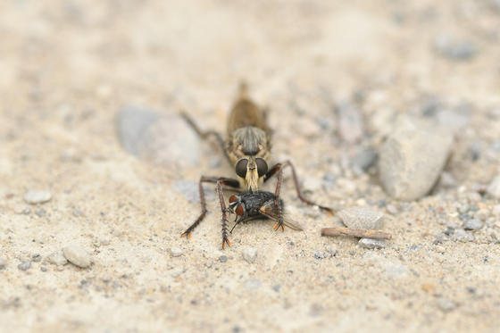A Robber Fly feeds on a fly that it just caught.