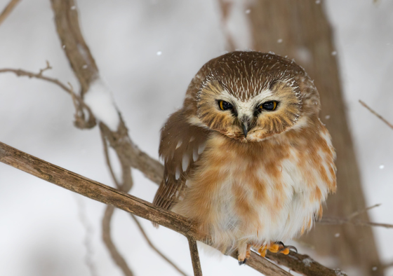 This little Saw-whet Owl had perched itself at the side of woodlot path behind some houses in Wasaga Beach, to take shelter from a heavy snowfall.