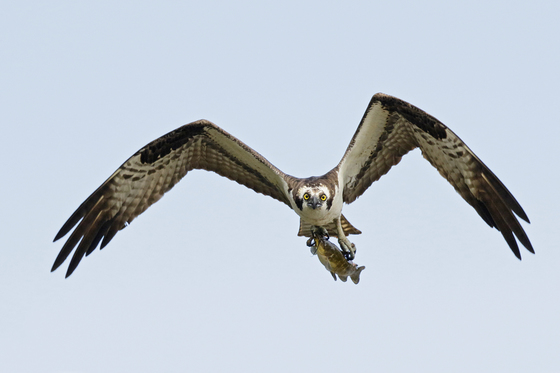 Before migrating South in October there are a large number of osprey catching fish at the top end of Burlington Bay. I was lucky to have this one fly directly towards me.